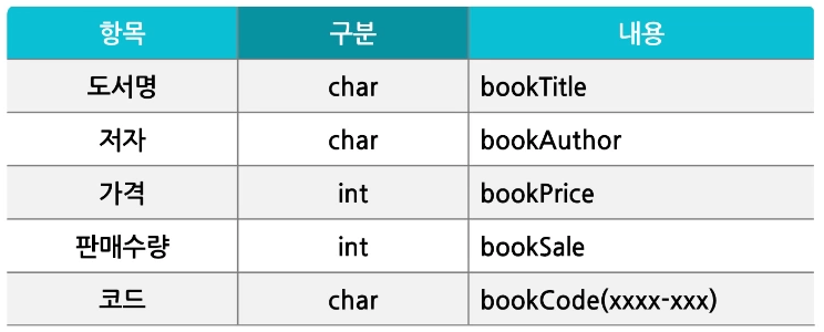 | - 도서명 - 가격 - 코드 - 저자 - 판매수량 - 베스트셀러 |