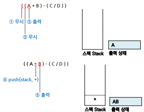 ④ 오른쪽 괄호를 만나면 스택을 Pop하여 출력함