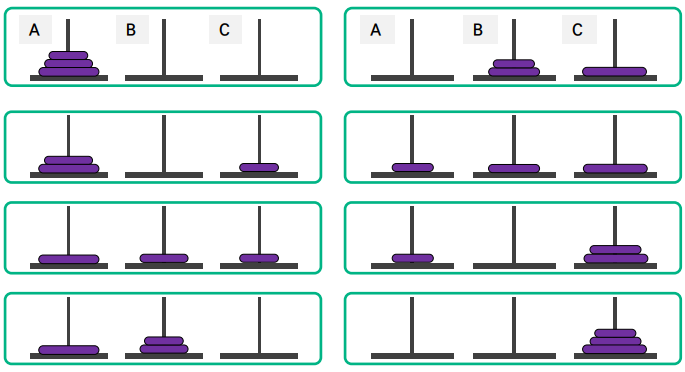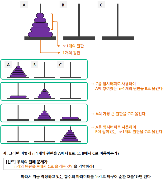 n-1개의 원판을 A에서 B로 옮기고 n번째 원판을 A에서 C로 옮긴 다음, n-1개의 원판을 B에서 C로 옮기면 된다.