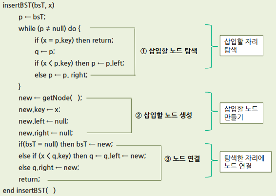 ▪ 삽입할 원소와 같은 원소가 트리에 있으면 삽입할 수 없으므로, 같은 원소가 트리에 있는지 탐색하여 확인함