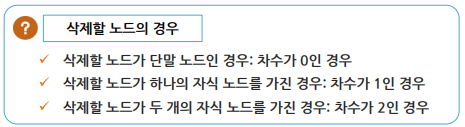 ▪ 노드의 삭제 후에도 이진 탐색 트리를 유지해야 하므로 삭제 노드의 경우에 대한 후속 처리(이진 탐색 트리의 재구성 작업)가 필요함