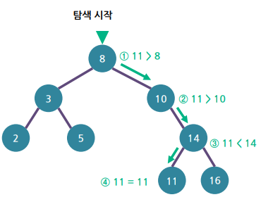 ① 찾는 키 값 11을 루트 노드의 키 값 8과 비교(찾는 키 값 11 > 노드의 키 값 8)이므로, 오른쪽 서브 트리를