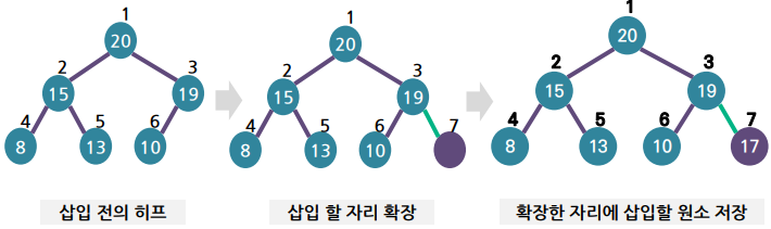 ▪ 완전 이진 트리를 유지하면서 확장한 노드에 삽입할 원소를 임시 저장함