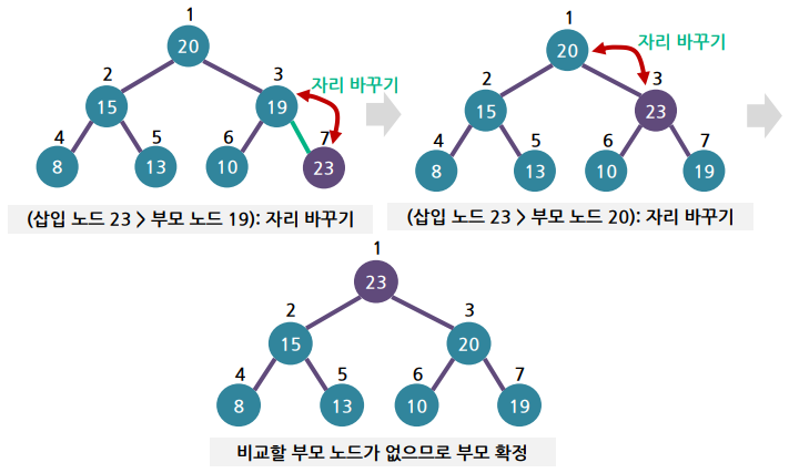 {현재 부모 노드의 키 값 ≥ 삽입 원소의 키 값}의 관계가 성립하지 않으면, 현재 부모 노드의 원소와 삽입 원소의 자리를 서로 바꿈
