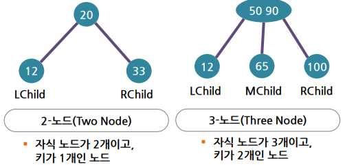 ▪ 3-노드는 자식을 가리키는 포인터가 3개 이므로 자식 노드가 없다면 2-노드에 비해 널포인터가 차지하는 공간적 부담