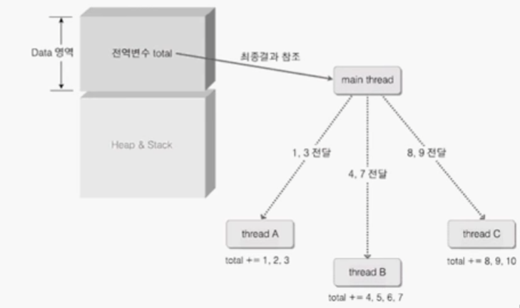 - 각각의 쓰레드가 전역변수 total에 접근하여 연산한 값을 저장
