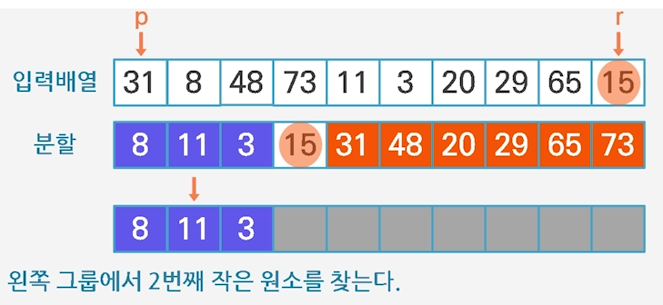 - 퀵 정렬처럼 분할한 후 자기호출 방법을 이용하여 평균적으로 선형시간에 i번째 작은 원소를 찾는 것