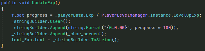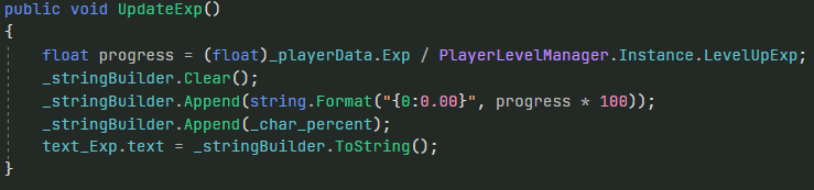 캐릭터의 경험치 진행율?을 구하기 위해 현재 경험치(Int형)와 목표 경험치(Int형) 변수 2개를 나눗셈하여 float형 변수 progress에 받으려고 했다.
