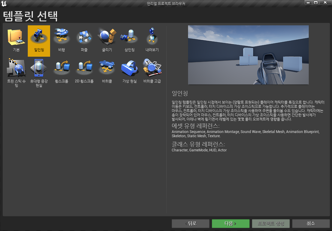 - 최근 UnityHub에서도 템플릿을 제공하고는 있지만 언리얼이 조금 더 다양한 템플릿을 제공한다. 원하는 템플릿을 선택하거나 기본을 선택한 후 다음을 누른다.
