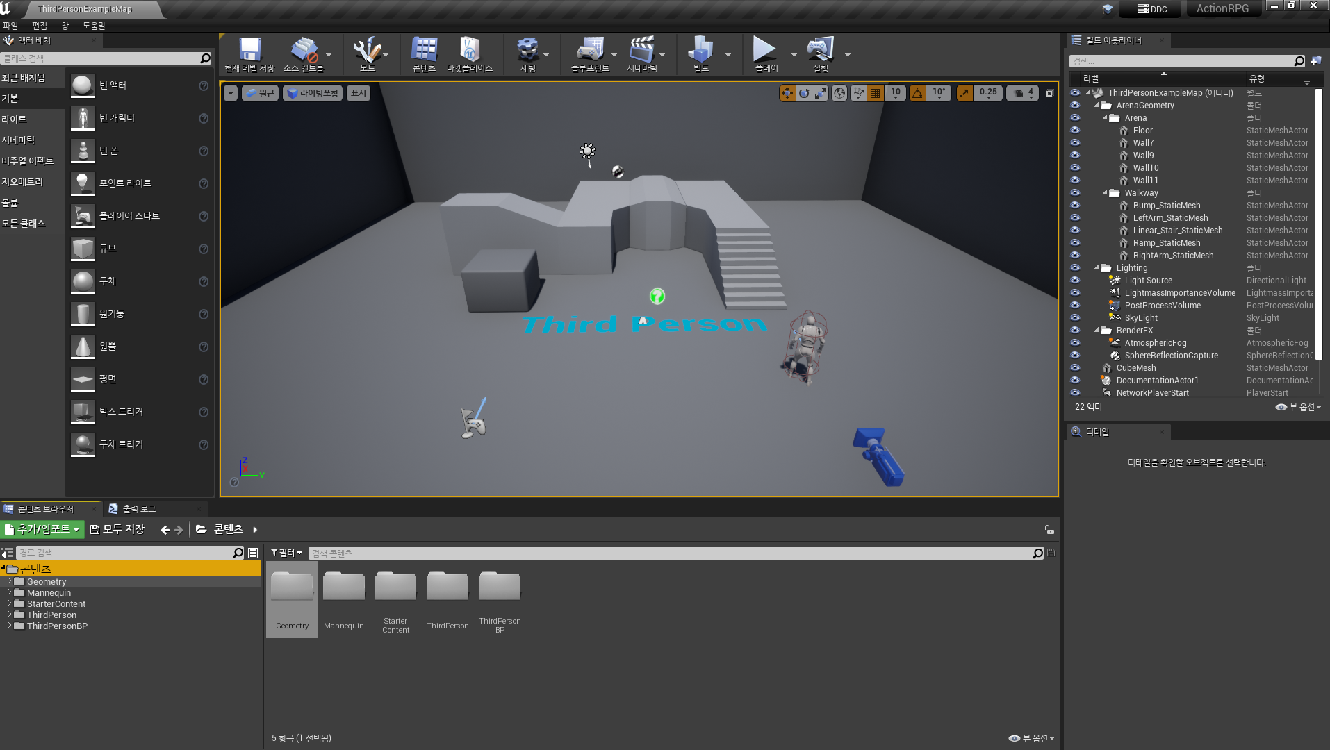 - Third Person 템플릿으로 생성한 프로젝트의 화면이다.