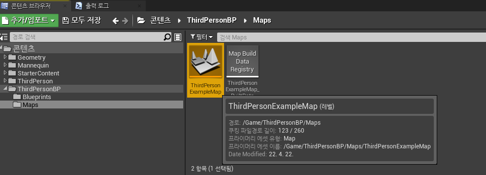 - 하단 콘텐츠 브라우저는 유니티에서의는 프로젝트 창과 동일하며, 유니티는 Assets 폴더를 루트 폴더로 지정되어 있다면, 언리얼은 콘텐츠(Content) 폴더가 루트 폴더로 구성되어 있다.