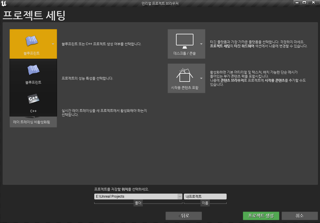 - 프로젝트 세팅 화면에서 먼저 비주얼스크립팅(블루프린트)으로 제작할 지, 코드 기반으로 할 지를 선택한다.